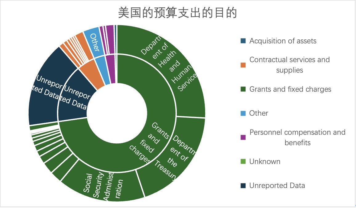 归属卫生与公众服务部Department of Health and Human Services的医保(Medicare)和医疗援助(Medicaid)、归属社会保障署Social Security Administration的社保、以及归属财政部Department of Treasury的国债利息,是美国联邦政府预算支出的大头,其支出占到了预算支出的一半以上。医保支出约有2.4万亿美元的规模(其中Medicare有1.7万亿美元,Medicaid有7000亿美元),而社保支出有1.5万亿美元。三者加起来,平均到美国3.4亿人头上,每个人要花7000多美元,实在是甚大的数字。