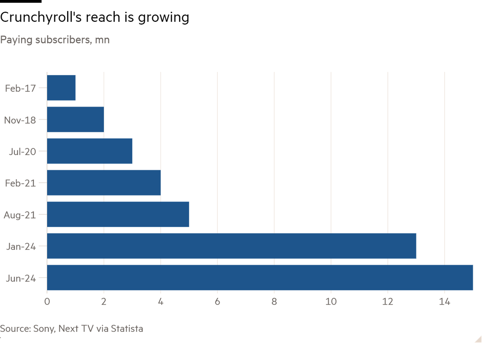 索尼公司是此类剧集manbetx app苹果 受众不断增长的最大受益者之一。这家日本企业集团的动漫流媒体服务Crunchyroll是最大的平台之一,在manbetx app苹果 200多个国家拥有超过1.3亿注册用户。美国、巴西和德国是其最大的市场。同样隶属于索尼集团的娱乐公司Aniplex是动漫视频和音乐制作领域的佼佼者,该公司在日本以外的业务也在不断增长。