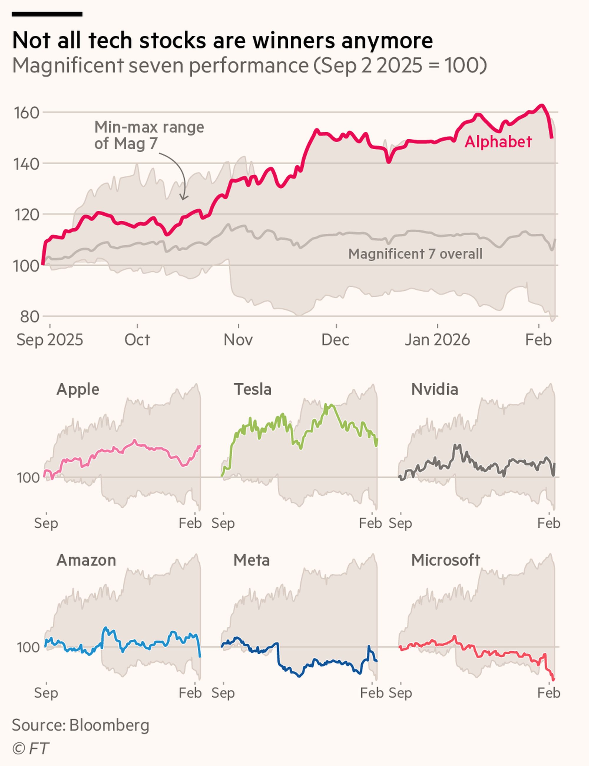 早上好。“瑰丽七股”(Magnificent Seven)的光环正在褪去吗?自2025年第四季度以来,这一著名的大型科技股组合表现低迷。Alphabet的涨幅勉强将“七大巨头”维持在正区间,而过去几年该组合中涨幅最大的芯片公司英伟达(Nvidia)却出现走弱。