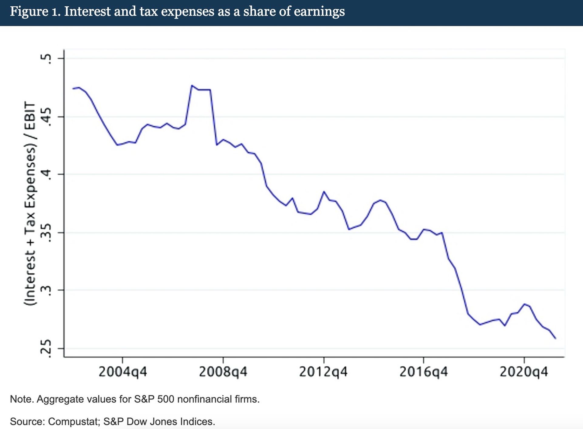 这份由美联储高级manbetx20客户端下载 学家迈克尔•斯莫利扬斯基(Michael Smolyansky)撰写的报告指出,在金融危机爆发前,利率和税收支出与息税前利润(EBIT)之比徘徊在45%左右。今年早些时候,这一比率跌至仅26%。