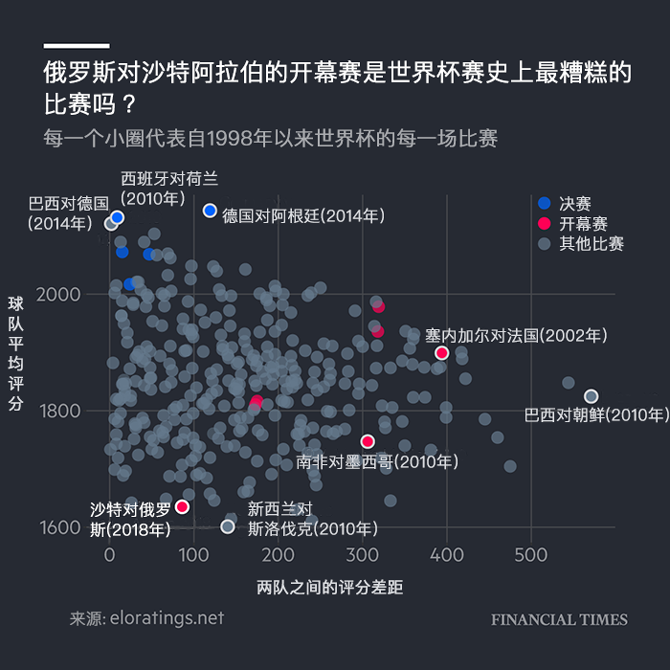 追踪世界杯比赛的“Elo排名”(World Football Elo Ratings),可以当作一个参考。Elo主要根据国家队的历史比赛表现、以及对手的成绩加以评分。我们可以发现,昨晚两个自然资源强国的比赛,可以算得上是1998年以来,最不精采的世界杯开幕赛(见下图)。