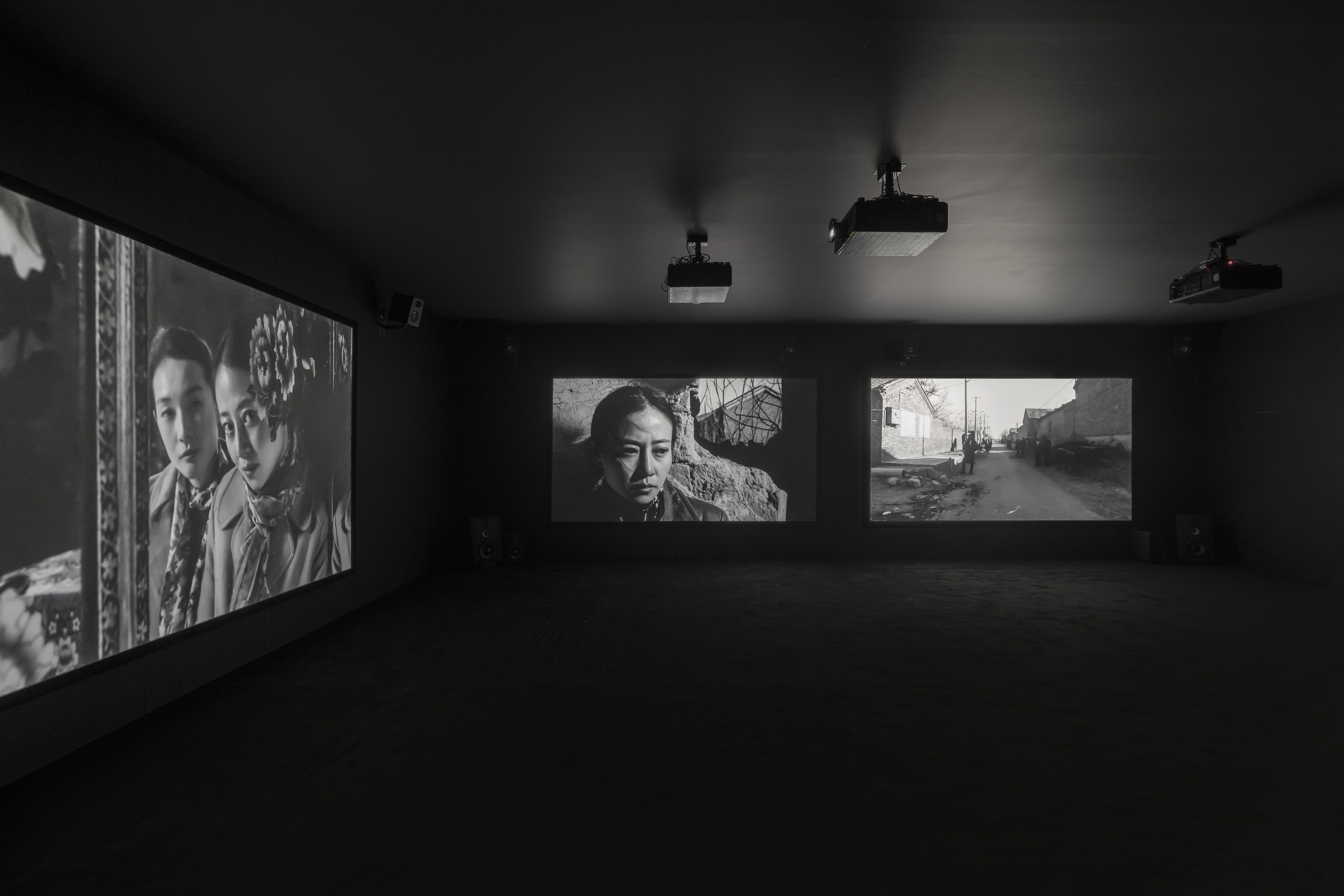 《香河》(剧照),2016-2025,15频黑白有声数码影像装置,图片由杨福东工作室提供“你可以将这次展览整体看作一种沉浸式的、立体的‘电影’。从入口处的巨幅海报开始,观众其实就已经进入了叙事的开端。”