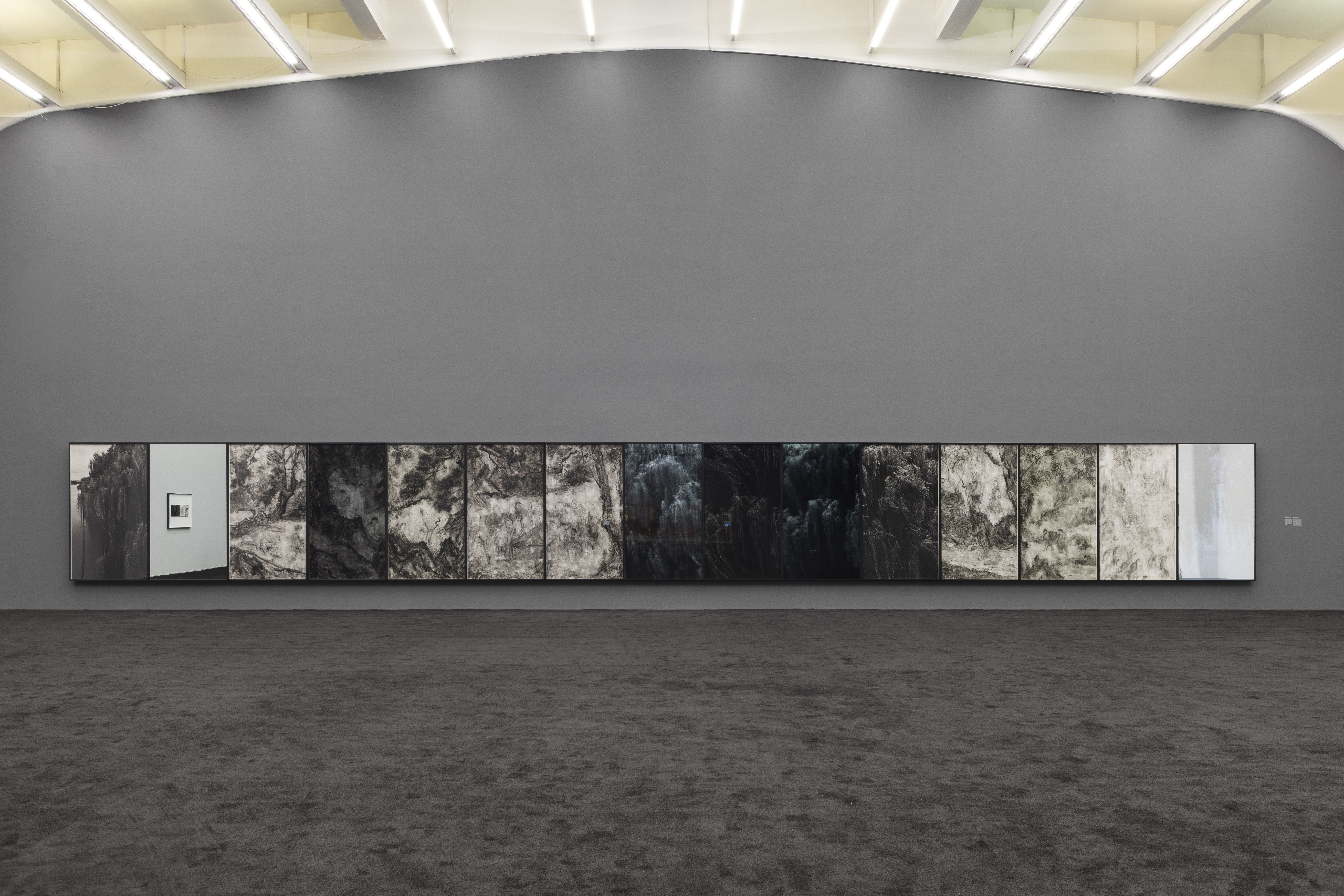 匆匆的导览中,杨福东走到一排占满整面墙壁的联画作品跟前,在这个位置,视线几乎可以一览整个展厅。