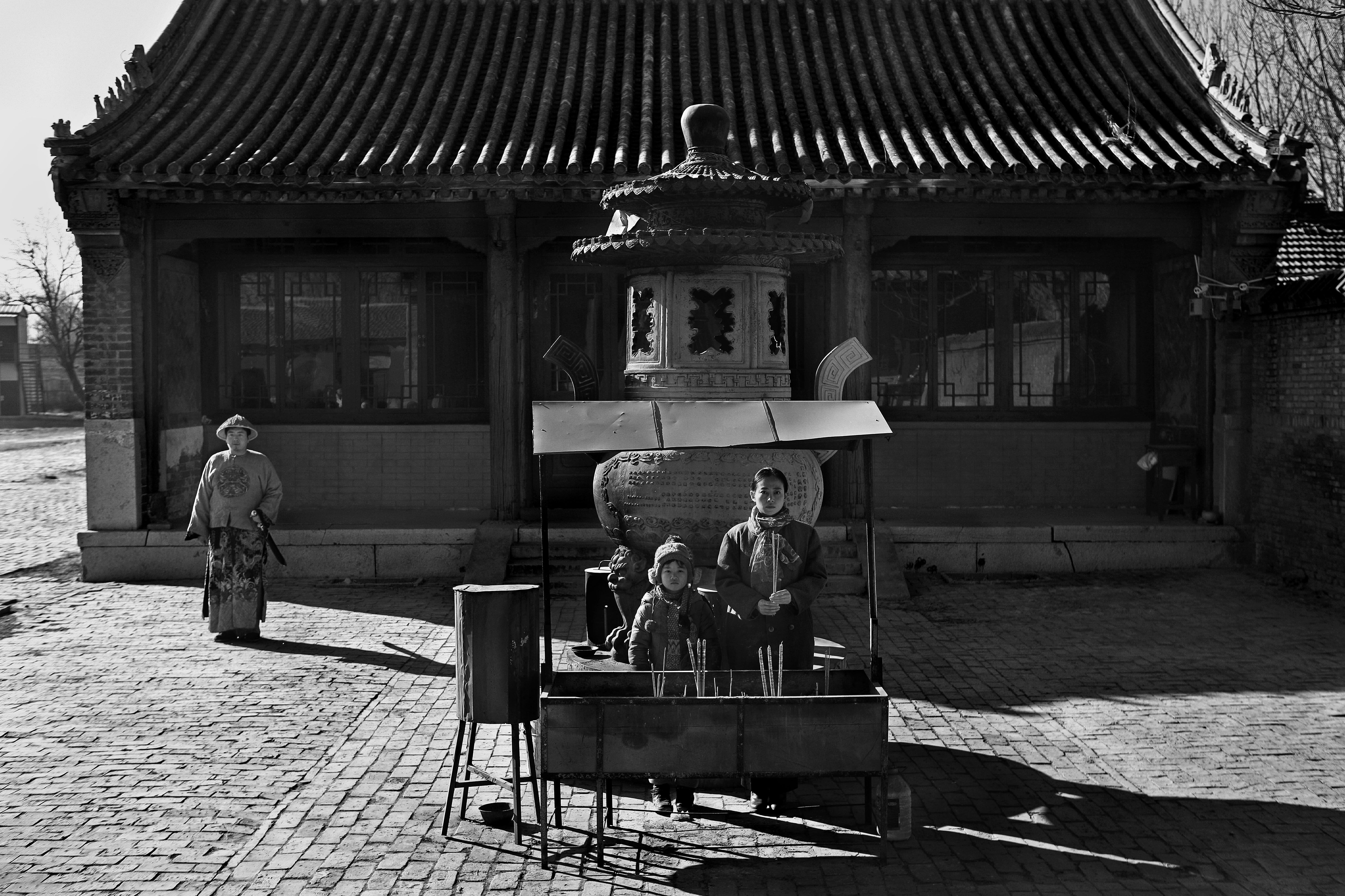 杨福东:《香河》中有一幕超现实的画面:一座古庙门口,站着一名穿着古代武士服装的护卫,他配着刀,站在母亲和孩子的身后。我觉得一个家庭中,有时母亲是雷厉风行、十分能干的,而父亲往往任劳任怨、言语不多,他在更多的时候更像是某种坚实的后盾,无声地庇护着这个家庭,防备着隐患发生,就像一个带刀的侍卫。
